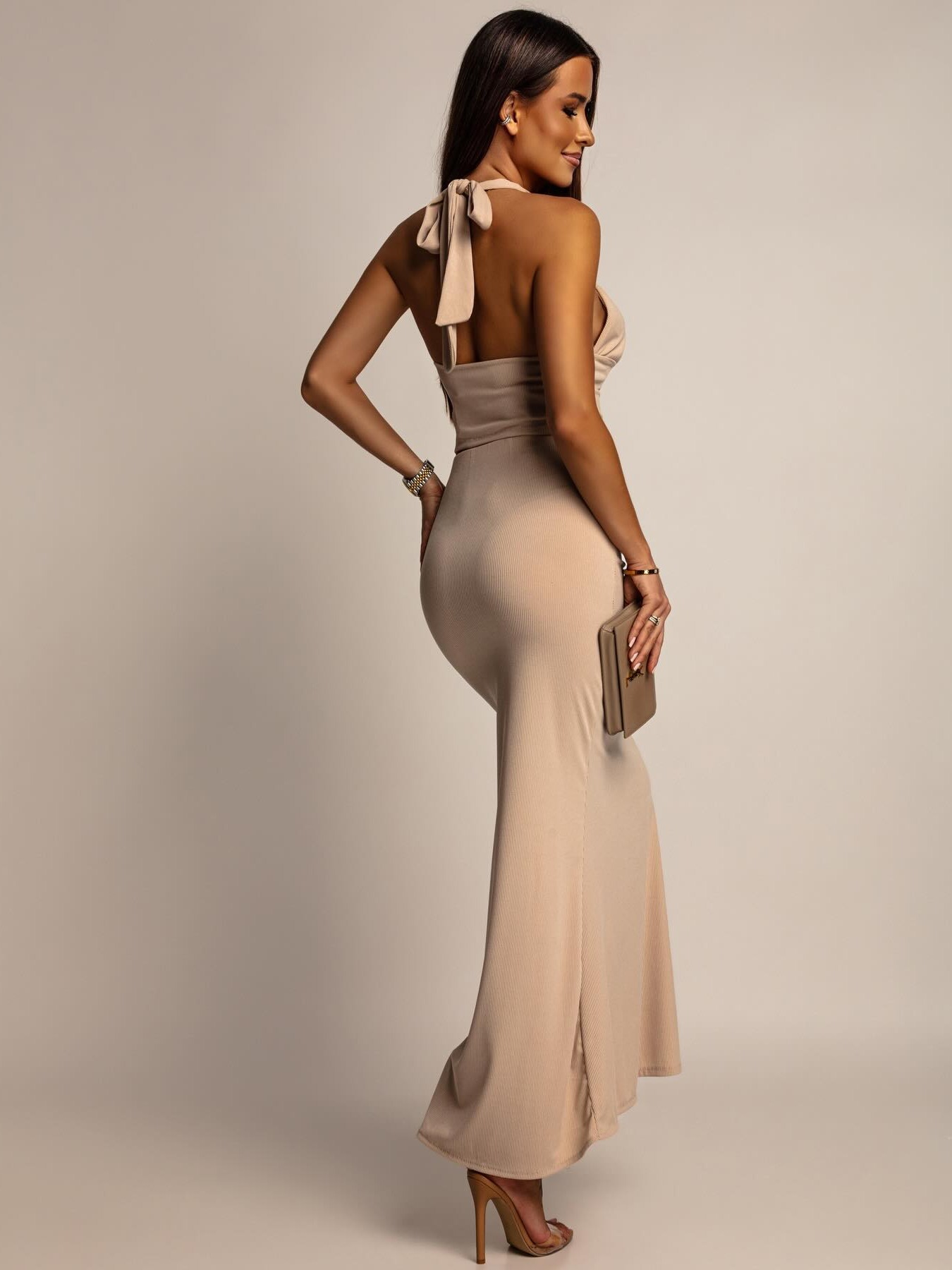 Wiązanie na szyi oraz głęboki dekolt w kształcie litery V pięknie eksponują ramiona i linię biustu, dodając sylwetce lekkości.
