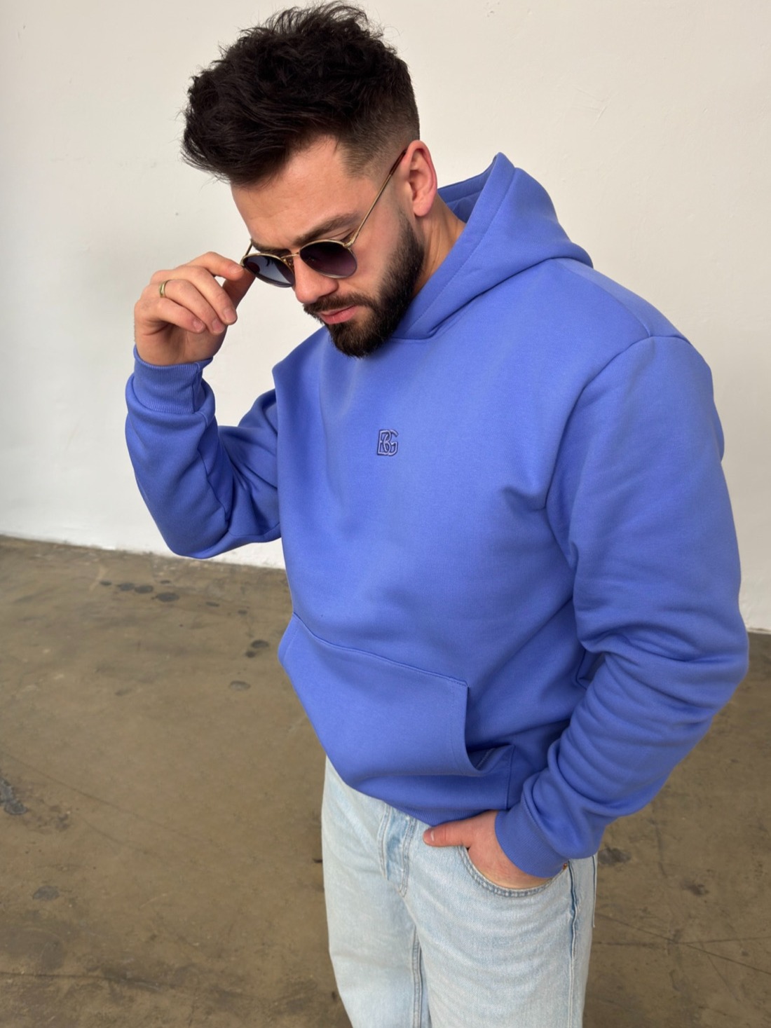 Bluza męska BG SPECIAL z wysokiej jakości bawełny ocieplanej. Klasyczna bluza z haftowanym logo marki w tonacji materiału na środku. Bluza kangurka wykończona ściągaczami. Kieszeń na przodzie.
