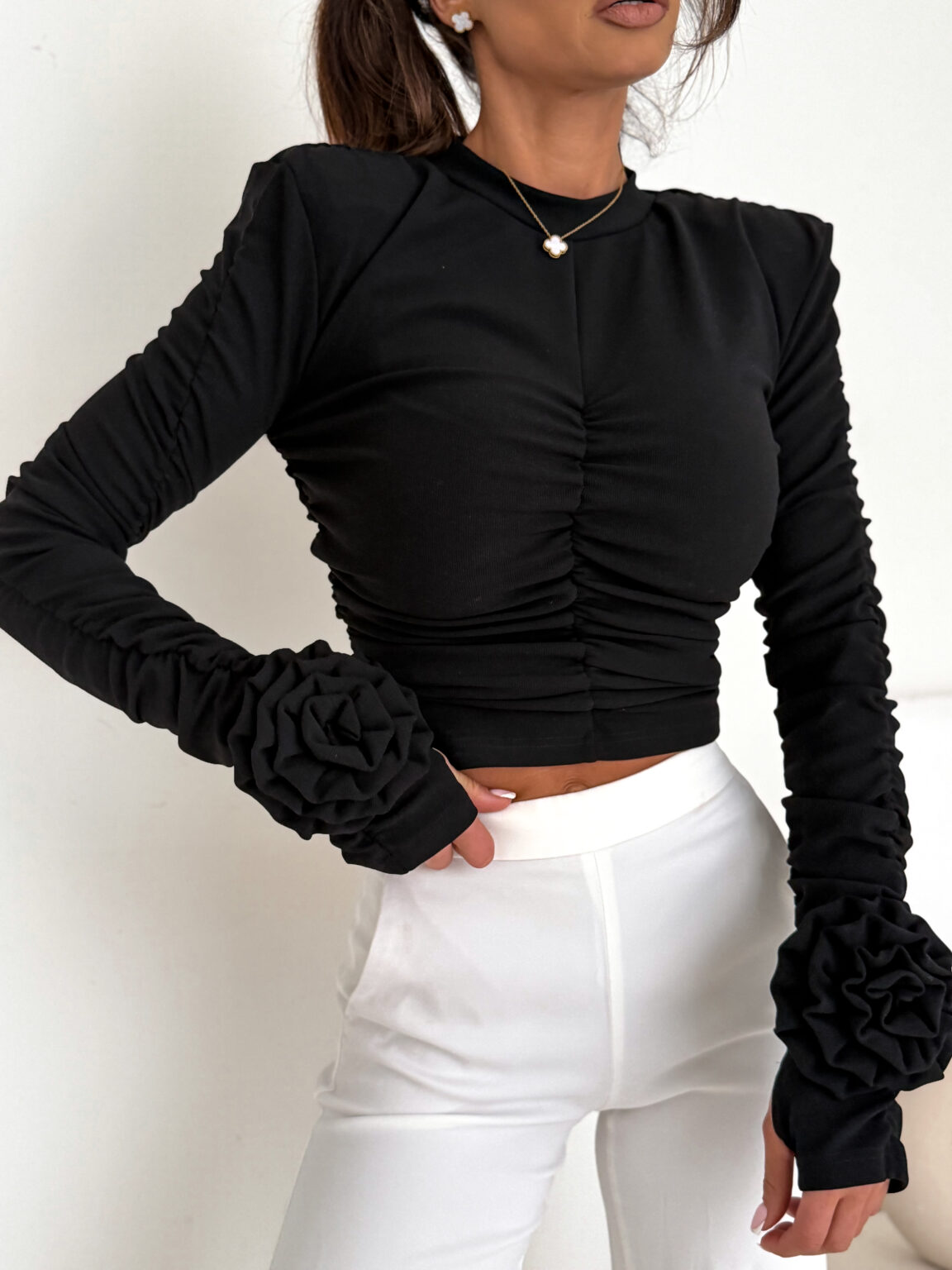 Bluzka uszyta z elastycznego materiału fitness , idealnie dopasowująca się do sylwetki. Model z poduszkami. Dodatkowo 2 róże na agrafkach, które mogą być w dowolnym miejscu.