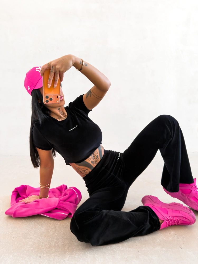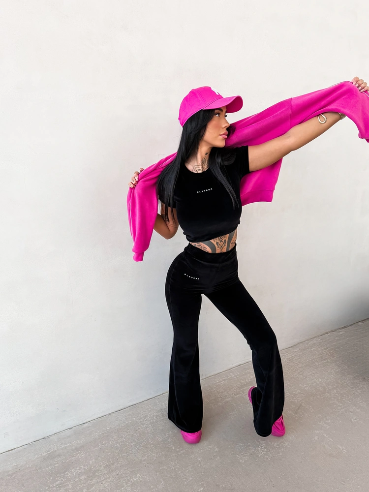 Spodnie z wysokim stanem, które doskonale modelują talię. Dopasowane w górnej części, przechodzą w modne, rozszerzane nogawki typu dzwony (flare), które optycznie wydłużają nogi.