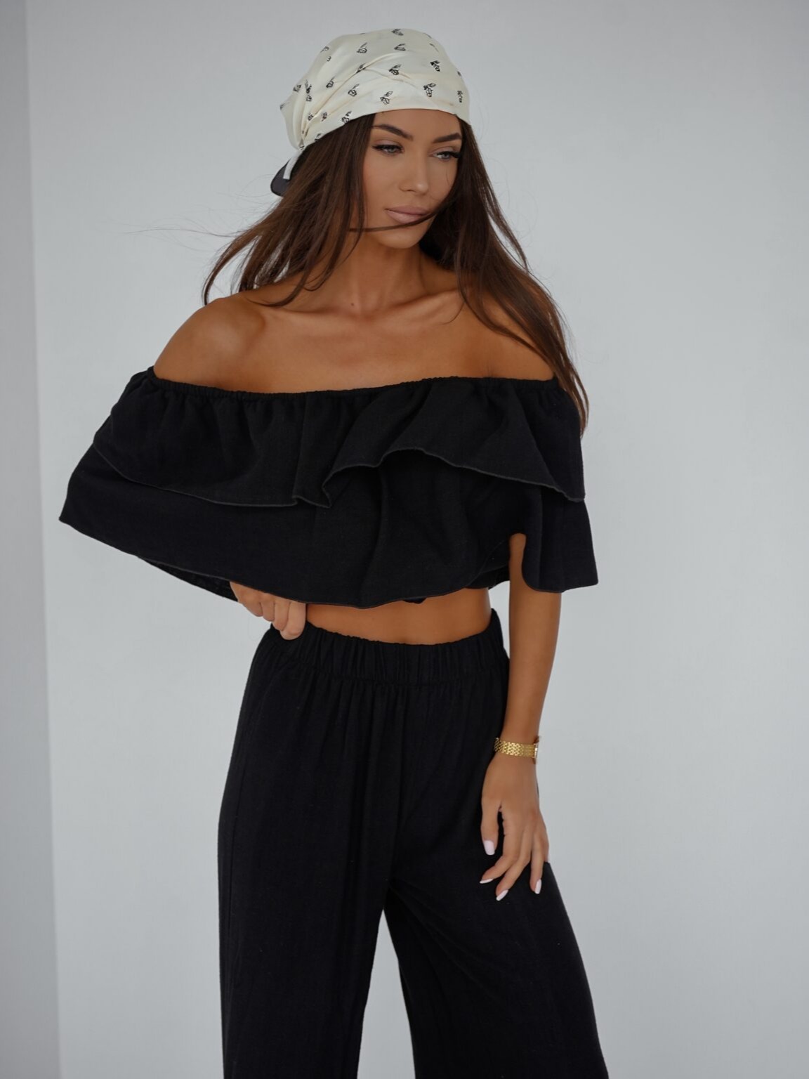 - Krótka bluzka typu hiszpanka z efektowną, dwuwarstwową falbaną pięknie eksponuje ramiona i linię szyi. Elastyczne wykończenie sprawia, że top idealnie trzyma się sylwetki.