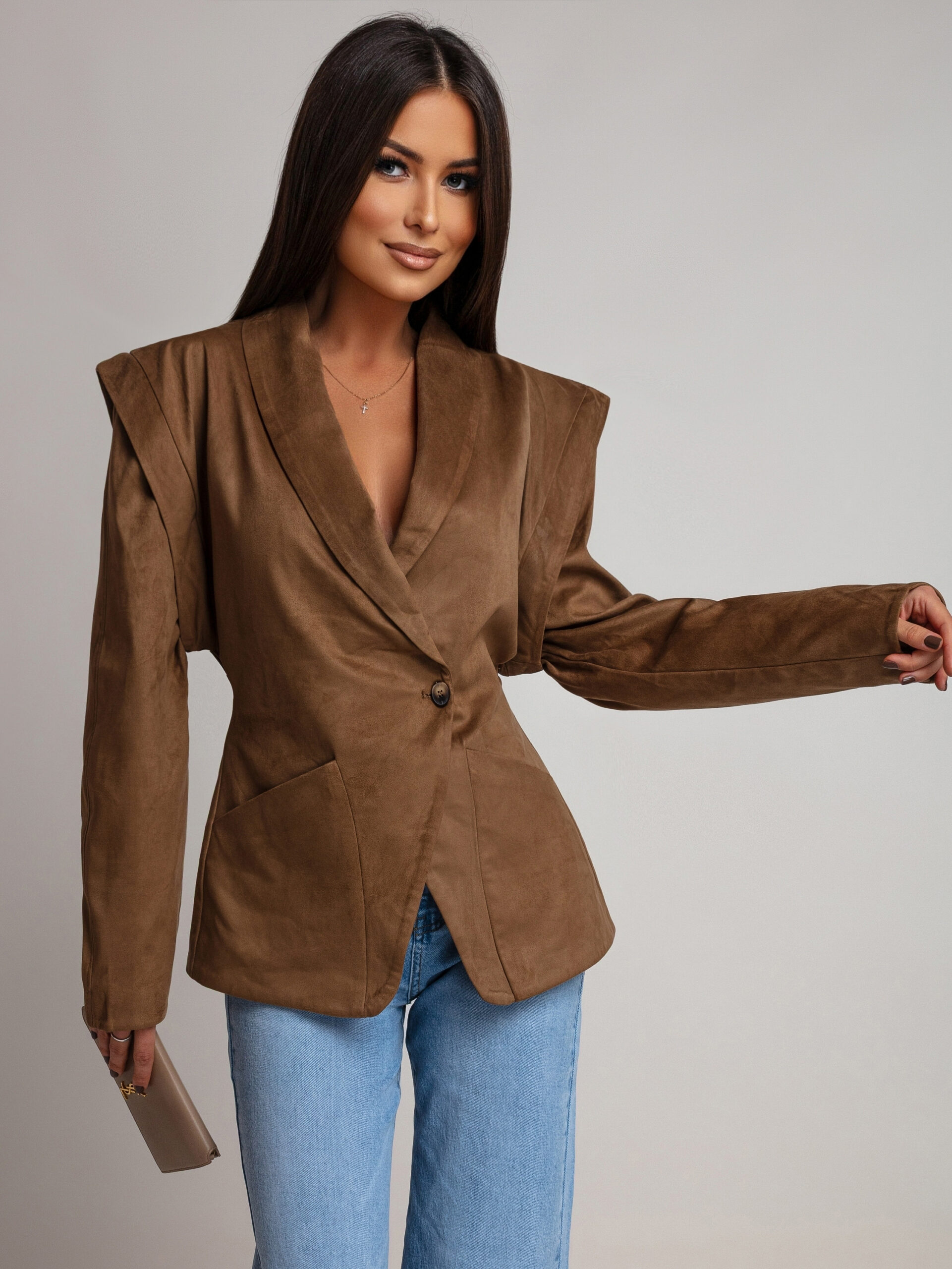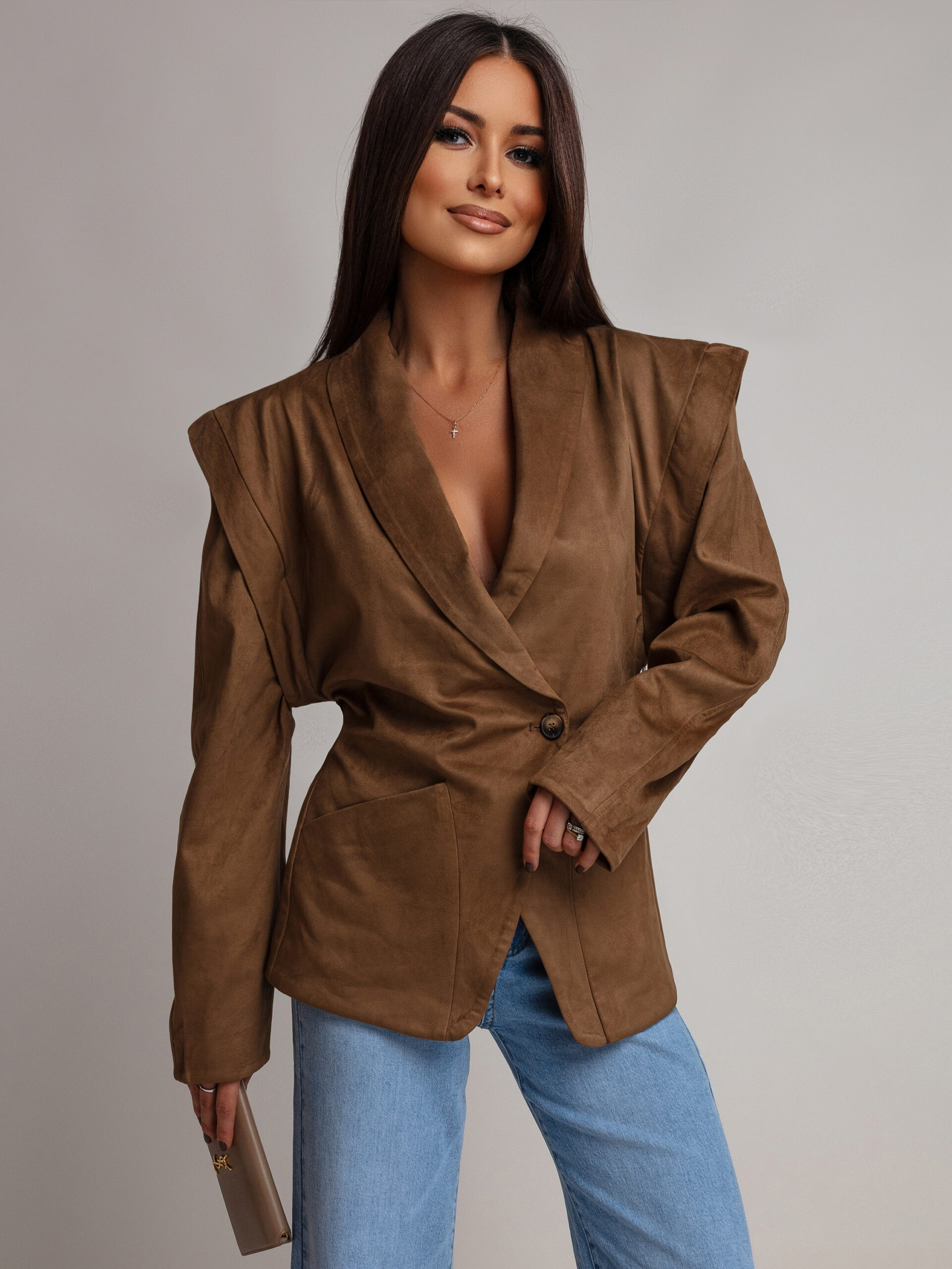 Nasza zamszowa marynarka w kolorze camelowym doskonale komponuje się z wieloma stylizacjami. Możesz ją nosić zarówno do eleganckich sukienek, jak i casualowych jeansów. To idealny wybór na każdą porę roku – zarówno na chłodniejsze wieczory, jak i jako dodatek do wiosennych czy jesiennych outfitów.
