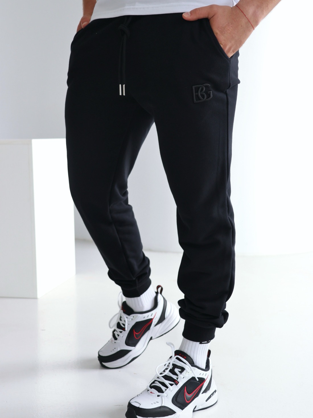 Spodnie BG BRAND z wysokiej jakości bawełny nieocieplanej. Klasyczne spodnie dresowe z wyhaftowanym logo marki na nogawce. Kieszenie w boku oraz gumka ze sznurkiem w pasie. Spodnie wykończone ściągaczami.
