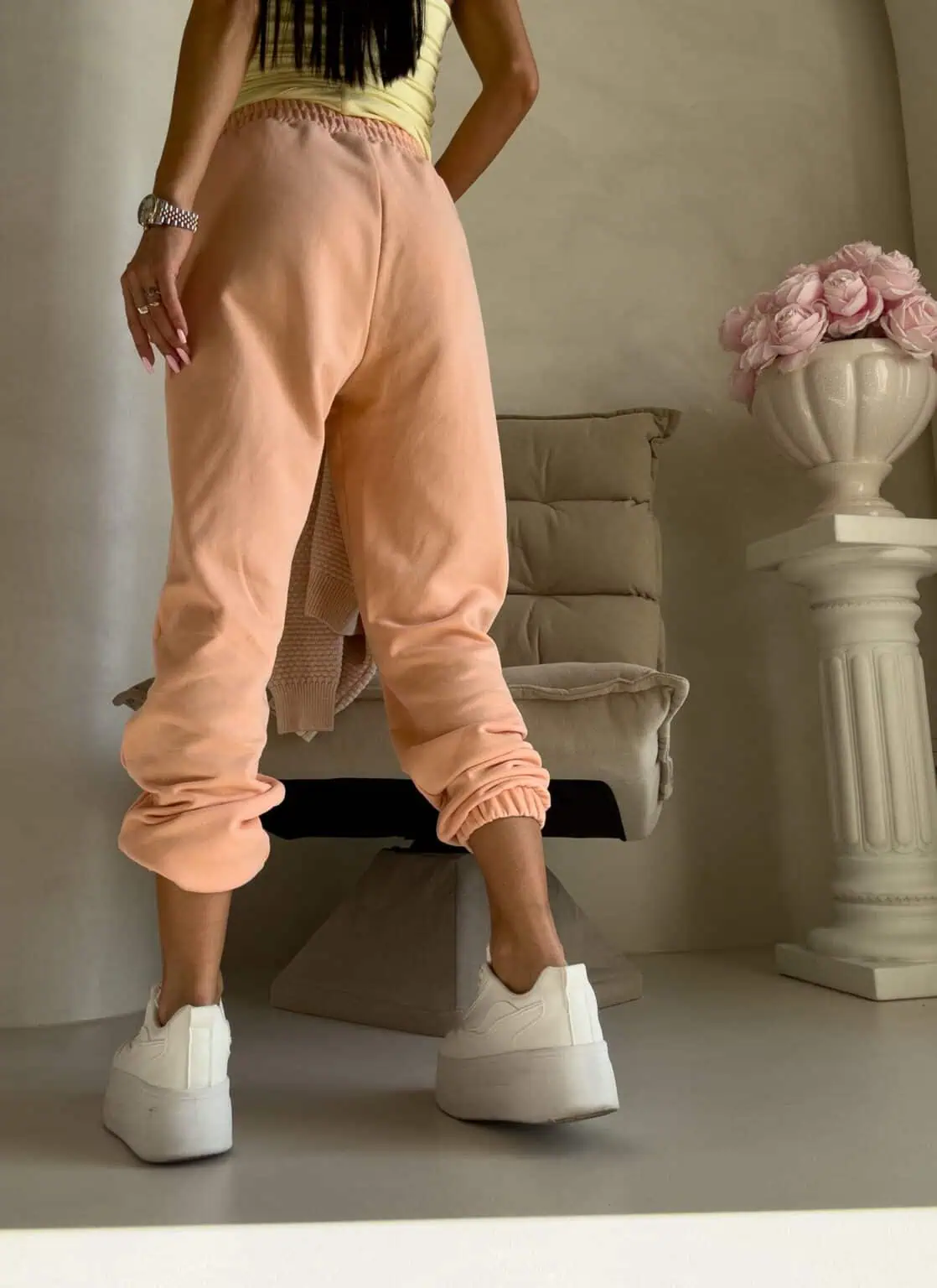 - Fason: Spodnie o klasycznym kroju joggerów z wysokim stanem, który pięknie podkreśla talię i zapewnia komfort noszenia.
