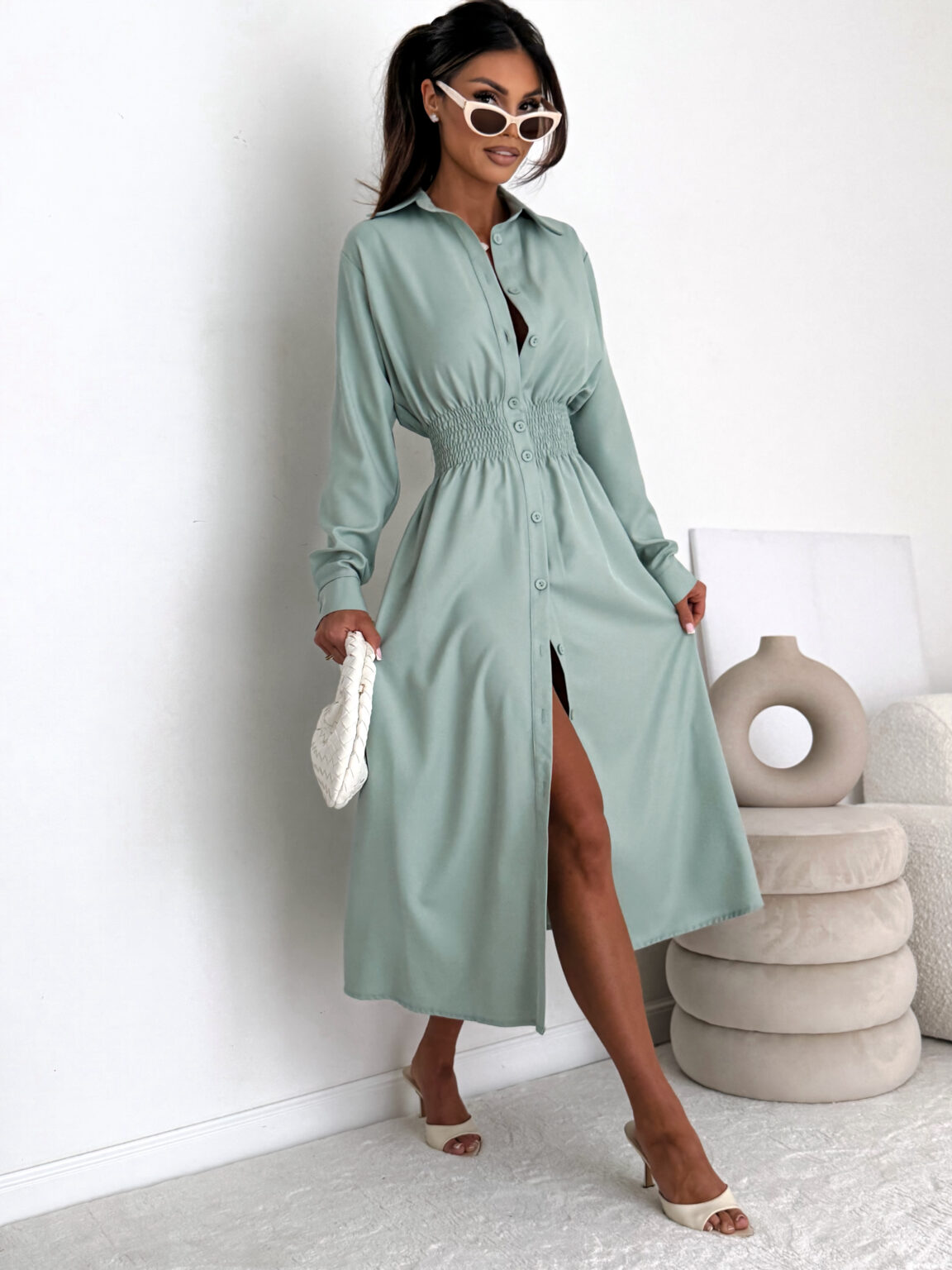 Ta wyjątkowa sukienka midi została zaprojektowana z myślą o kobietach, które cenią sobie styl i komfort. Długość midi sprawia, że jest to idealny wybór zarówno do biura, jak i na wieczorne wyjście. Długie rękawy oraz delikatne guziki z przodu dodają klasy, a marszczenie w talii pięknie podkreśla sylwetkę, modelując ją w subtelny sposób. Dodatkowy urok dodaje rozcięcie, które odsłania nogę, nadając całości lekkości i kobiecości.