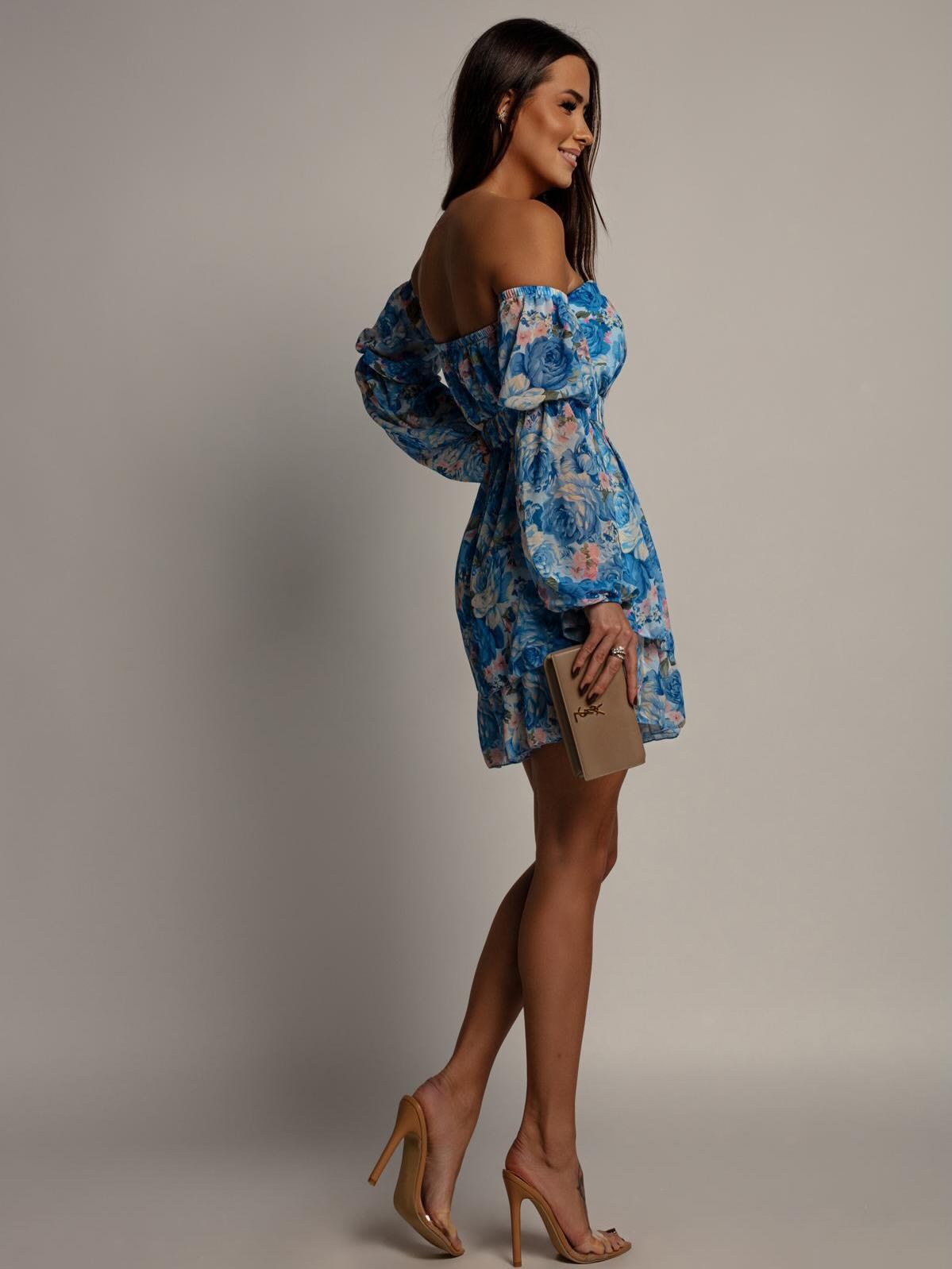 Sukienka Hiszpanka Mini w niebieski Kwiatowy Print KAYTLIN z Paskiem