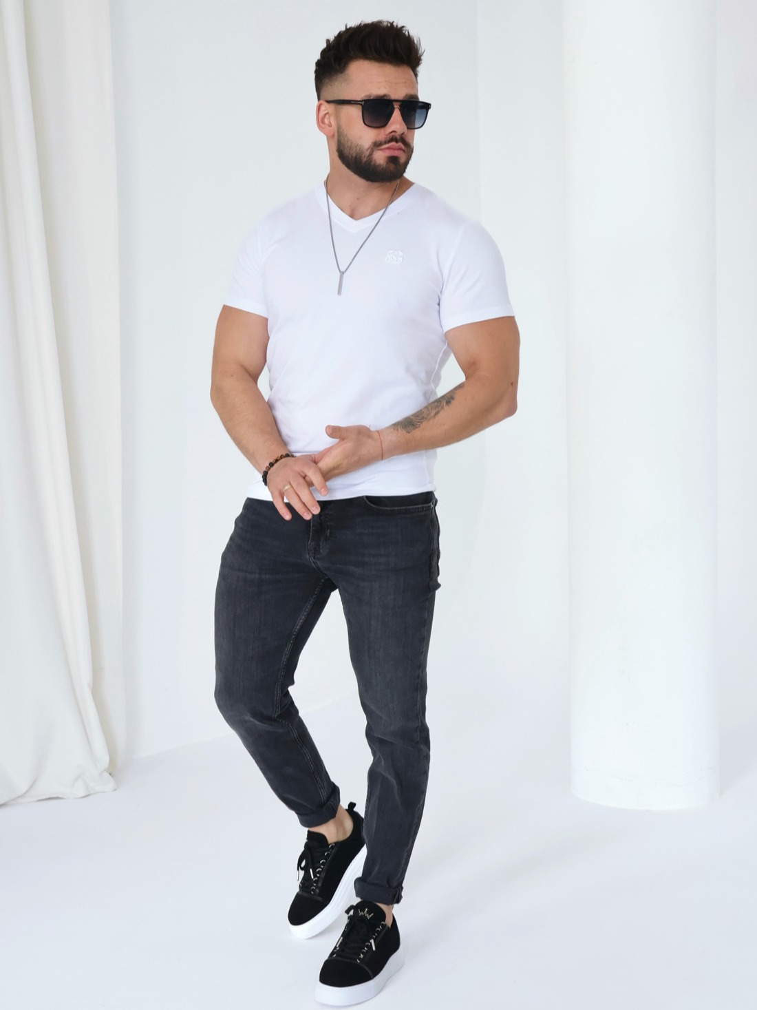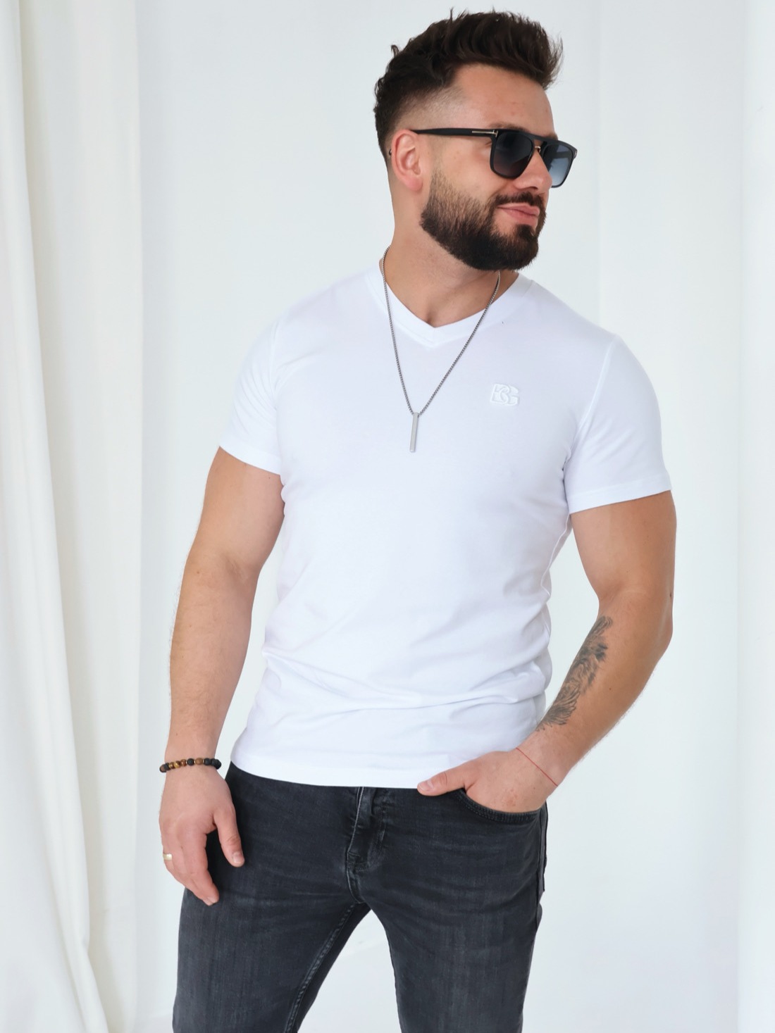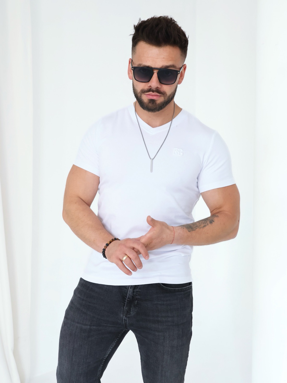 Męski T-shirt BG VOLTA z wysokiej jakości elastycznej bawełny. Idealnie dopasowuje się do sylwetki. Dekolt w kształcie litery „V”. Logowanie marką BG na piersi.