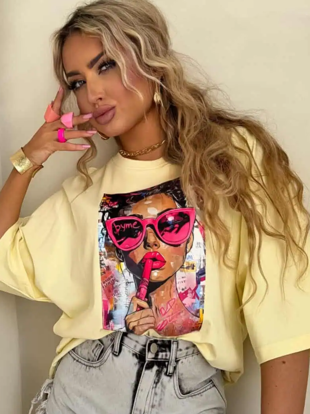 Ten t-shirt to model PINK o luźnym kroju oversize, charakteryzujący się wyrazistym nadrukiem na przodzie przedstawiającym kobietę w różowych okularach przeciwsłonecznych.