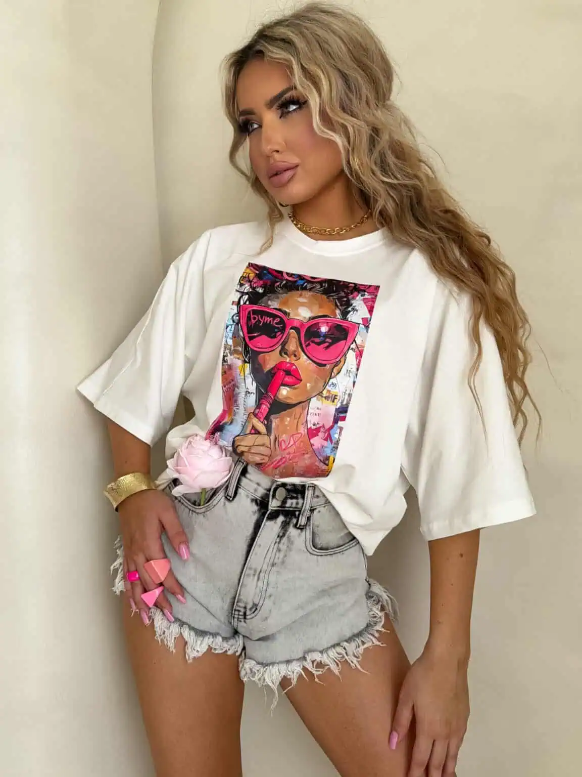 Ten t-shirt to model PINK o luźnym kroju oversize, charakteryzujący się wyrazistym nadrukiem na przodzie przedstawiającym kobietę w różowych okularach przeciwsłonecznych.